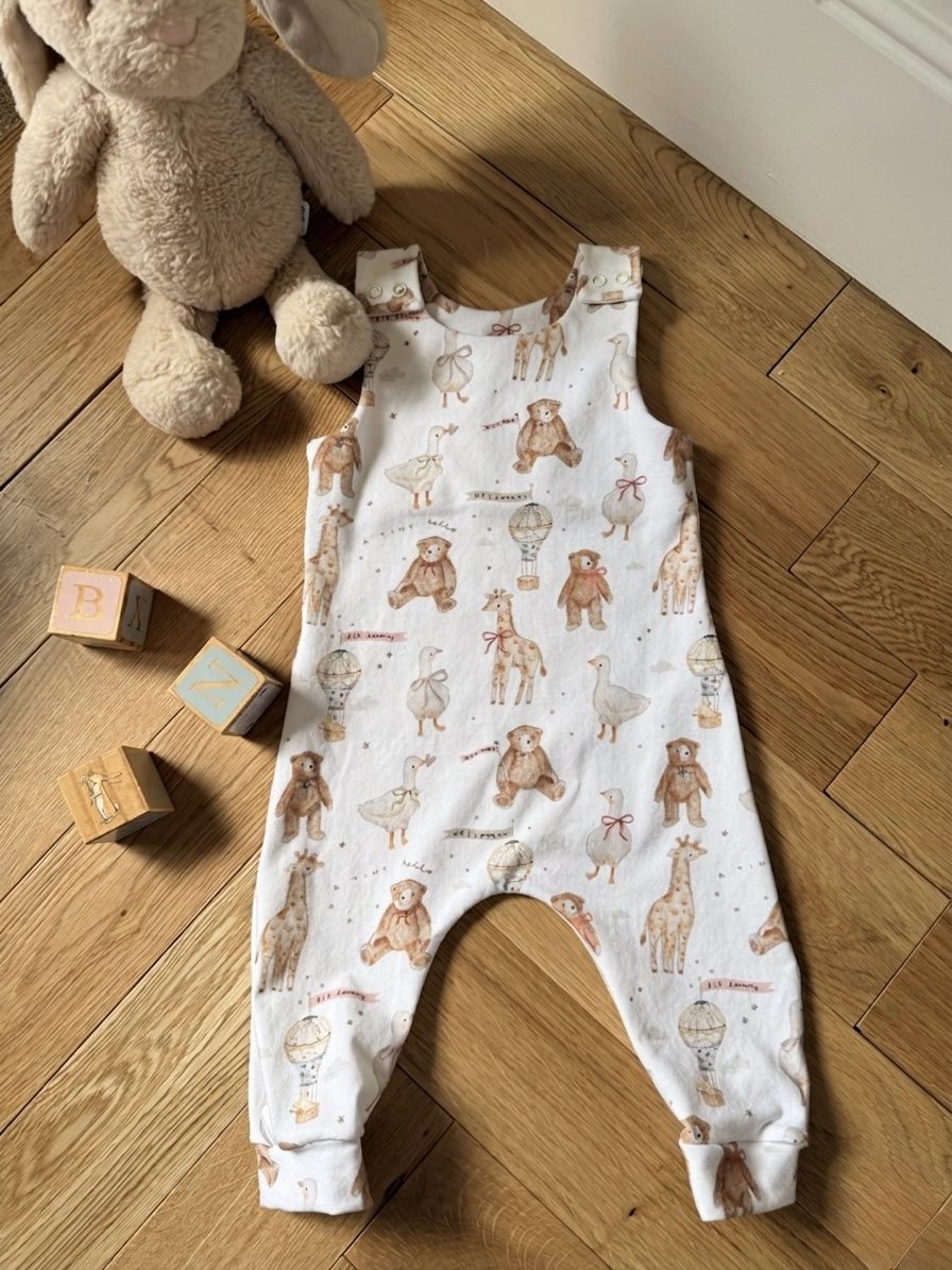 A harem-style romper with shoulder snap fastenings and relaxed drop crotch. Room for cloth and disposable nappies. Available in Blush and Sky in the Big Dreams print. Made to order in England.