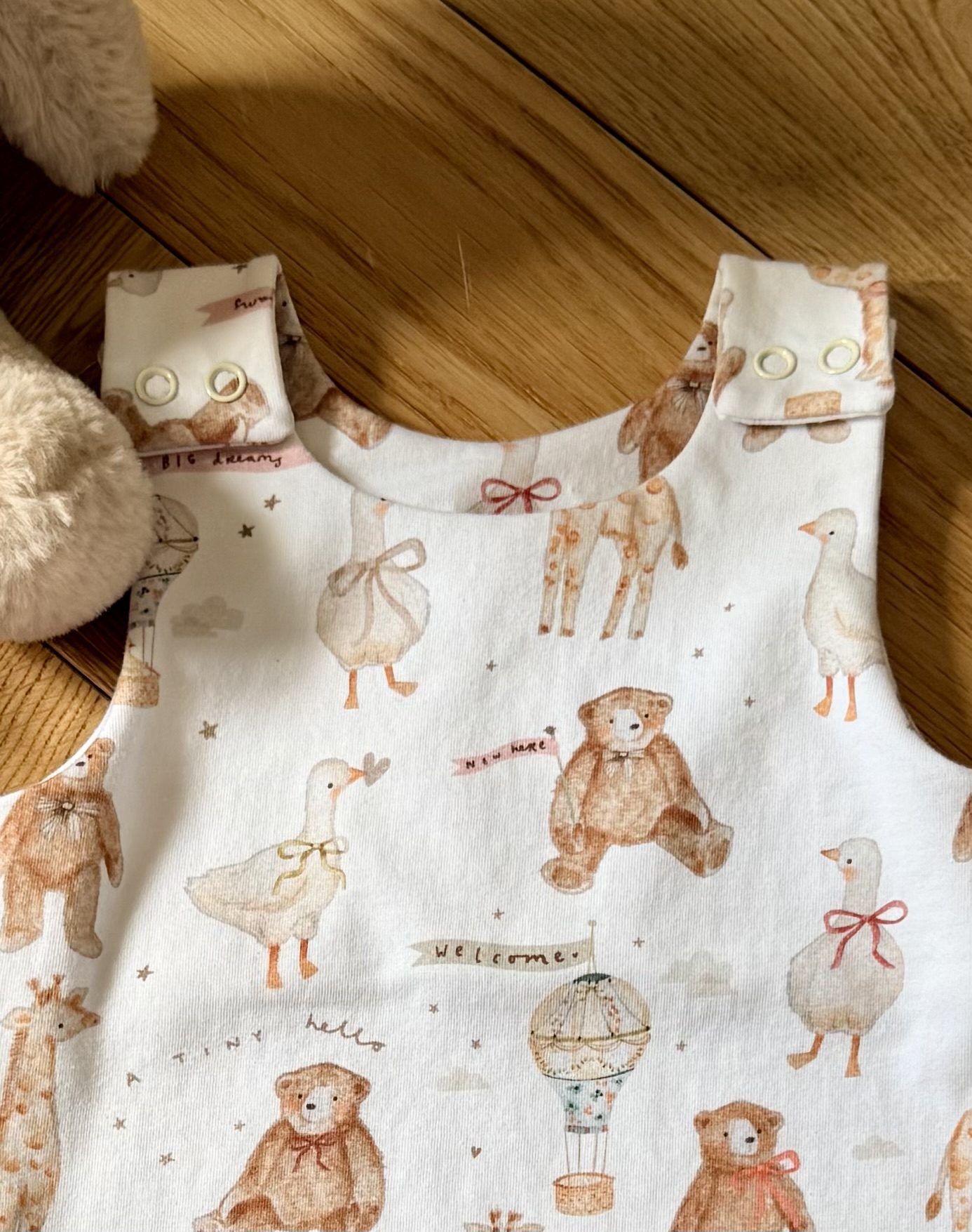 Available in Blush and Sky in the Big Dreams print — quiet, storybook, and made for the early months.