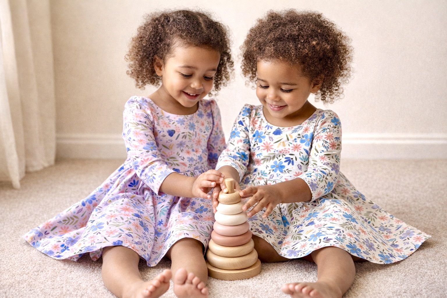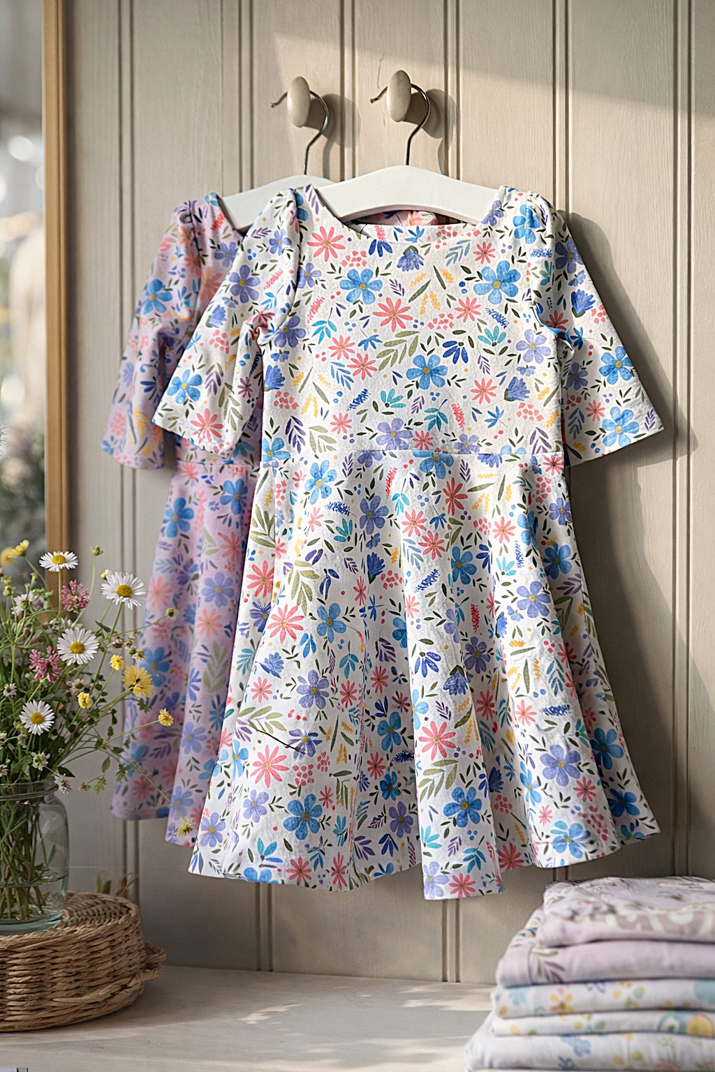 An elegant, vintage-length dress with a fitted lined bodice and statement puff sleeves. The skirt is made for twirling. Special enough for an occasion, soft enough for an ordinary Tuesday. Available in Lavender and White in the Meadow print. Made to order in England.